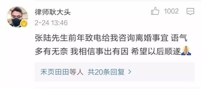在张陆回应的微博下,还有一条来自某律师的评论,称“张陆先生前年致电给我咨询离婚事宜”。