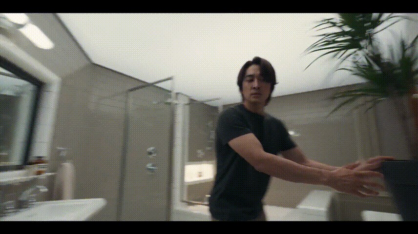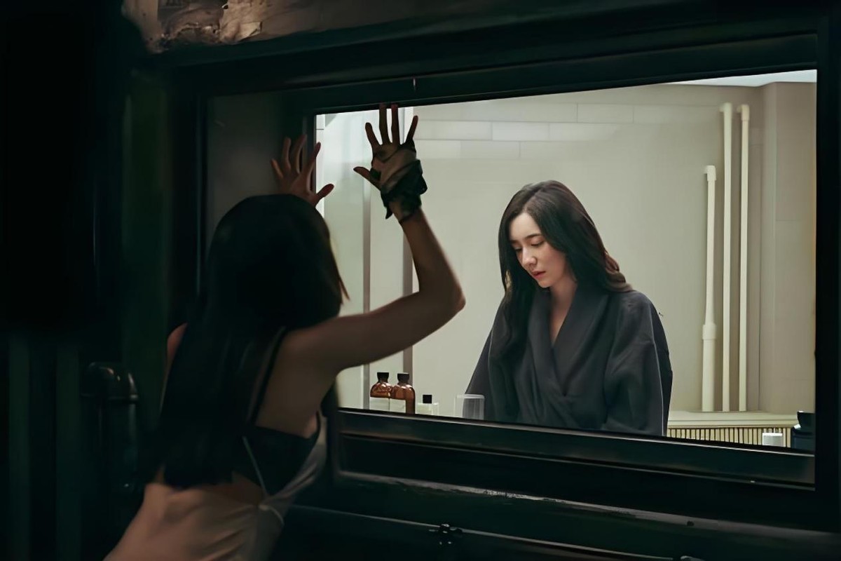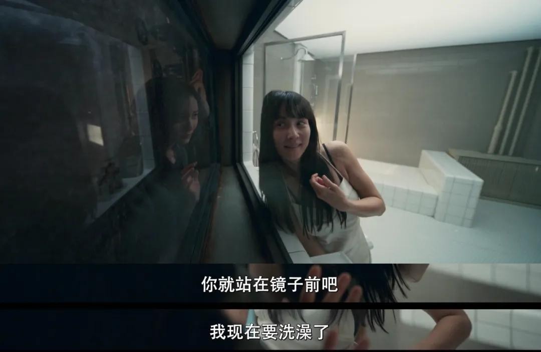 两人运动完毕后,美珠去浴室洗澡,镜头突然转到镜子背面!