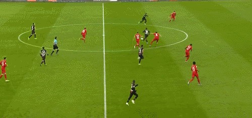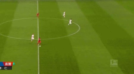 案例2:上文说过利昂贝利就是前场万金油,左中右通吃,直线加速,婀娜变向和内切样样精通。且看这场药厂大战拜仁,利昂贝利中圈拿球走右路高速穿过,在大禁区前沿横向内切过掉两名防守球员一脚低射,可惜滑门而过,但是假动作骗过了拜仁门将。