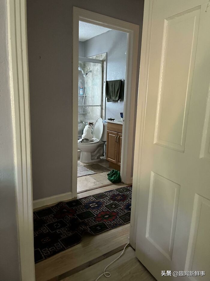 24.蹲马桶的猫咪发现有人拍照,正在惊讶地回头看着。