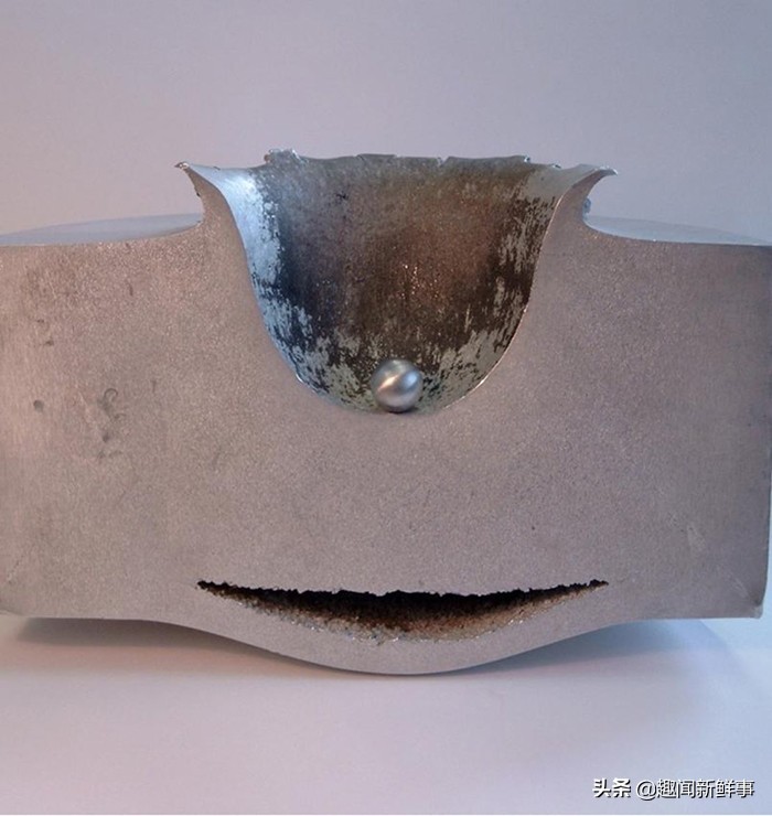 2.模拟小型空间碎片物体撞击航天器时会发生什么?这张照片显示了大约每秒6.8公里的速度行进的小铝球和18厘米厚的铝块之间的实验室测试碰撞结果。撞击坑的直径为9厘米,深度为5.3厘米。