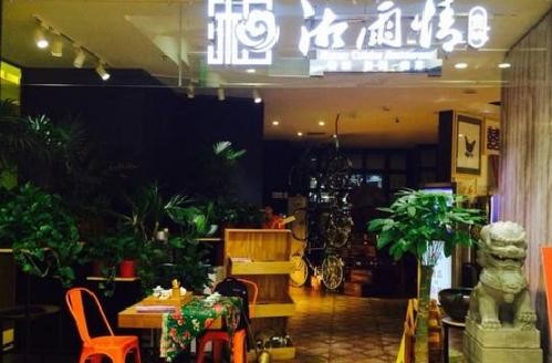 这是一家年轻人爱去的时尚、轻快风格的湘菜餐厅。沿着弯曲的小径,周围有着湖南特色的铜官窑,老百姓用来做咸菜等的日常所用之物,漆以绿色的外皮用架子大大小小地摆放着,配以些许竹子,以及投射在古色古香的墙上投影出的视频,踩在木质的地板上看来格外的有艺术气息。