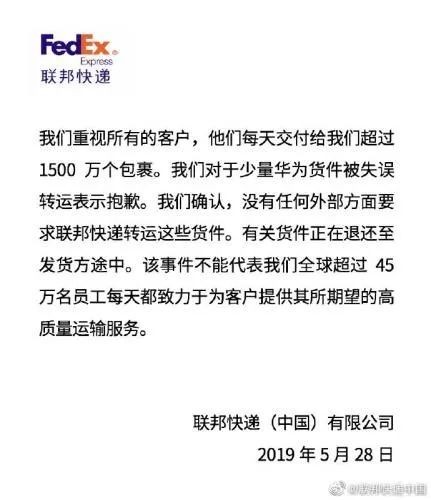 2、联邦快递致歉华为包裹被失误转运联邦快递(中国)有限公司28日通过微博发布公告称,对于少量华为货件被失误转运表示抱歉,没有任何外部方面要求联邦快递转运这些货件,有关货件正在退还至发货方途中。(中国新闻网)