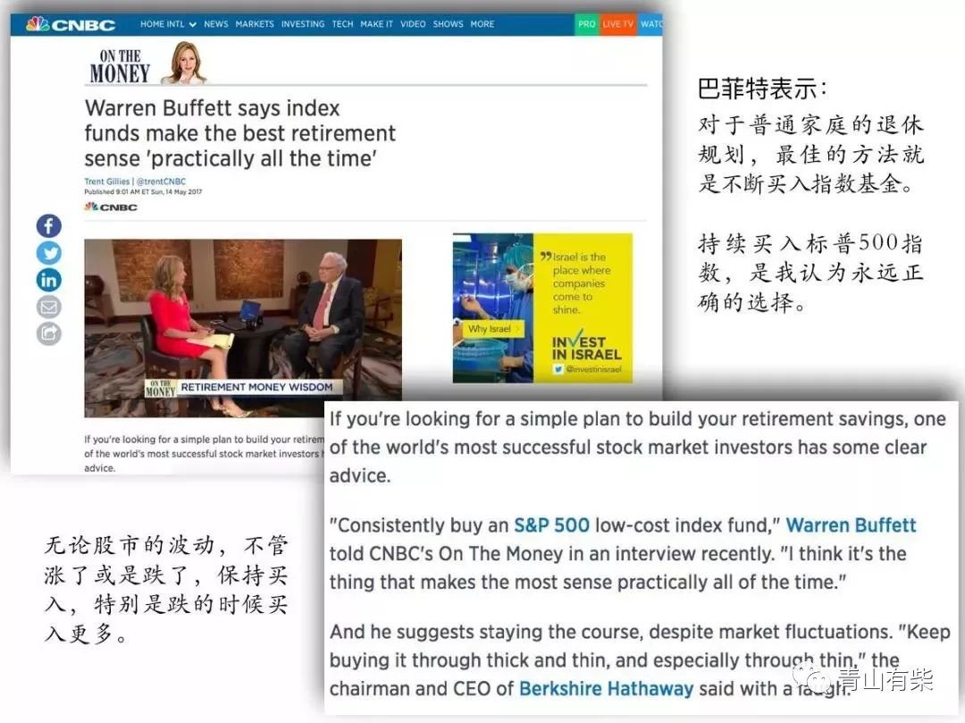 巴菲特接受《CNBC》节目专访,谈及退休金的问题,再次强调,不需要想太多,持续买入 S&P 500 指数型基金即可。他表示,不管市场好坏都要买,尤其是市场不佳的时候,更该买进,“通过定期投资于指数基金,那些门外汉投资者都可以获得超过多数专业投资大师的业绩!”