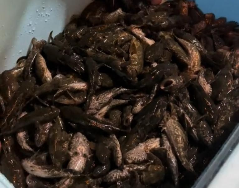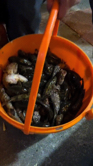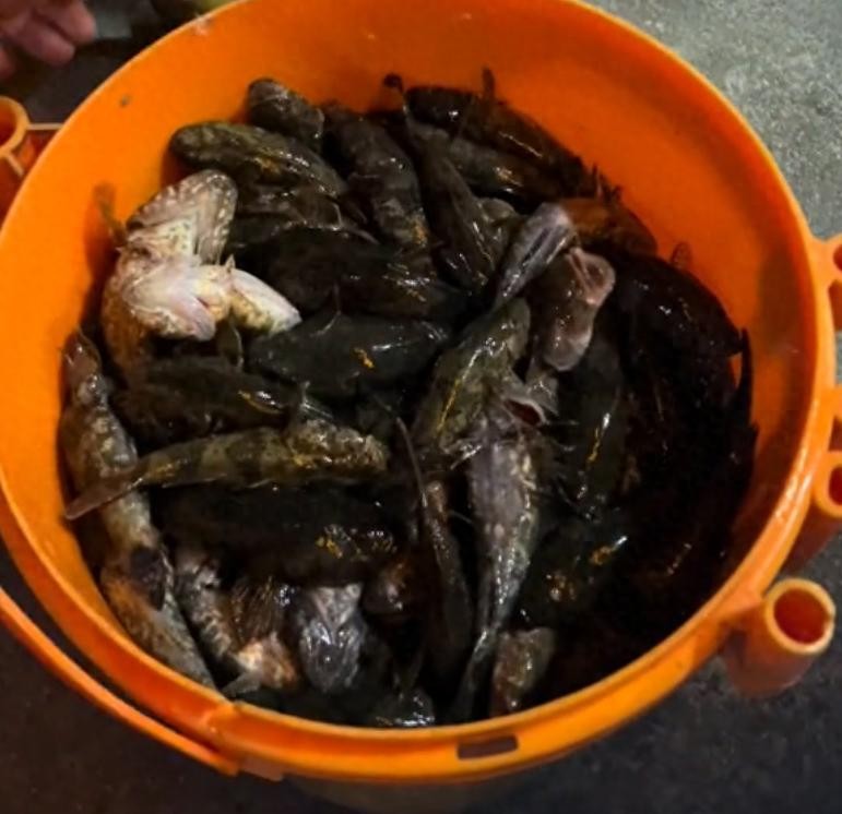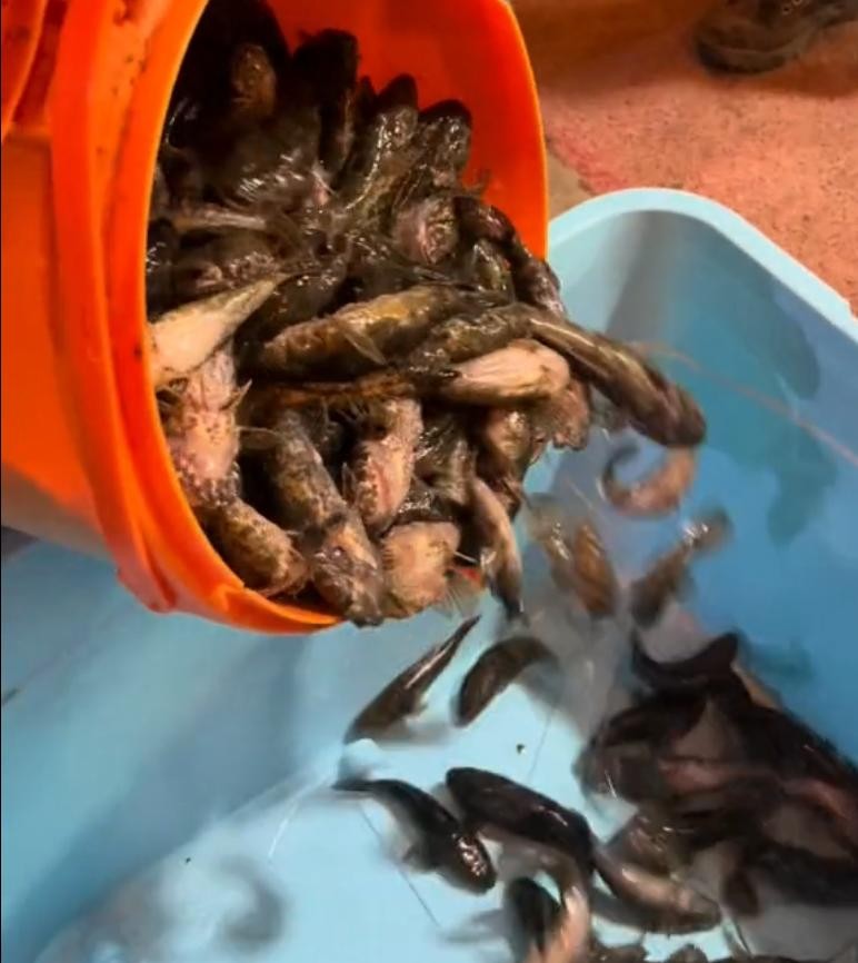 随后他也是将这些鱼倒入了一个塑料筐中,此时我们也可以发现这些鱼都是土步鱼,并且塑料桶里面一点水都没有加,以塑料桶的体型容量作为参考,这些土步鱼至少也能有50斤,也不知道这位博主是怎么钓的!