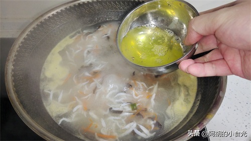 第五步:最后淋入两个鸡蛋清、加入黄瓜丝和香菜碎就可以关火了,再淋入一些芝麻油搅拌均匀就可以出锅了。一口尽是鲜美和温暖,细细品尝还可以品道银鱼的柔软,营养又好味道。