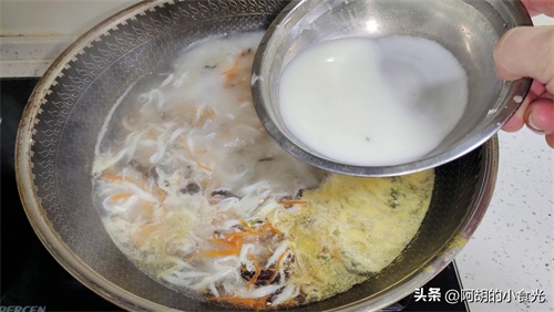第四步:保持中小火小煮个1分钟左右,撇去表面的一些浮沫,再加入食盐和胡椒粉调味,此时准备加了鸡精的淀粉水淋入锅内,边淋入边搅拌,同时保持大火,让汤汁渐渐浓稠起来,浓稠度为”米汤“状态即可。