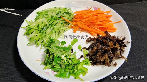第二步:辅料也很简单,只需准备黄瓜切丝,胡萝卜一小块切丝,黑木耳泡发后也切丝,香菜切碎待用。还要准备两个鸡蛋清搅碎待用。