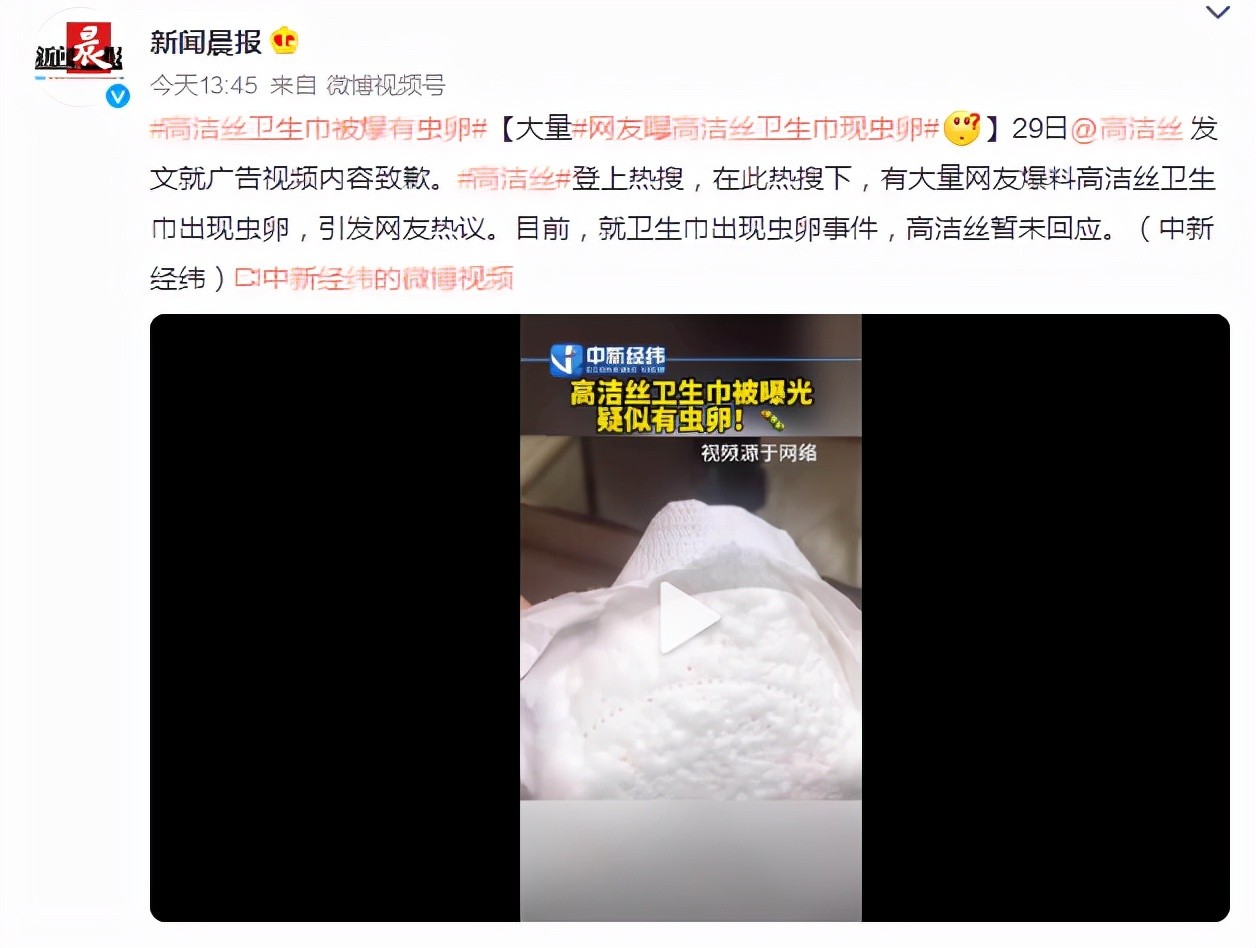 然而,这轮风波还未过去,又一则热搜再将高洁丝送上风口浪尖。12月29日,有大量网友在社交平台爆料在产品中发现疑似虫卵的物体,多家媒体对此事进行了报道。这下网友又不干了,有网友直接调侃道:“可能高洁丝自己也知道自己东西不干净,所以改做抹布、鞋垫了。”还有网友表示:“终于知道为什么高洁丝会发布这么反智的广告了,原来是想转移视线。”