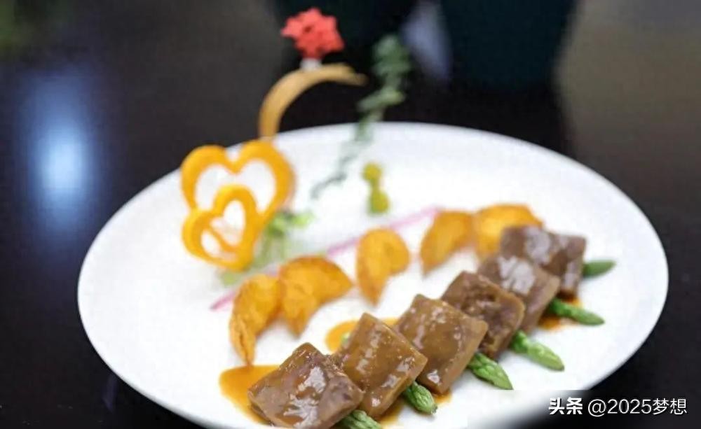 “蝴蝶肝膏汤”最见功夫。猪肝切片冲血水,加鸡脯肉、蛋清打泥,过滤五次去泡沫,蒸的时候先大火4分钟再小火9分钟,最后压成蝴蝶形。这哪是做菜?简直是雕刻艺术品。还有“金猪低温鸭肝夹”,烤金猪片、冻鸭肝酱、炸方包片三层叠,乳猪的焦香、鸭肝的绵密、面包的酥脆,层次比小说情节还丰富。以前总觉得创意菜是“花架子”,现在才懂——真正的创意,是把普通步骤做到极致,让家常菜有了宴席的仪式感。