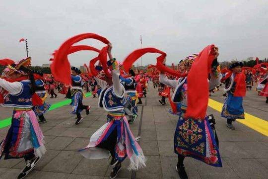 开幕式现场,人山人海、锣鼓喧天、羌歌嘹亮……北川各族儿女唱着古老的歌谣,踏着欢快的舞步表达着心中的热情和喜悦,共同庆祝这欢乐 幸福的时刻。羌族麻龙马灯、许家湾十二花灯戏、高跷狮舞、羊皮鼓舞……一系列原汁原味的非遗表演让在场观众连连称赞。特别是2000余人共 跳羌族沙朗的壮阔场面,引得数万观众连连拍照,生怕错过每一个精彩的瞬间。