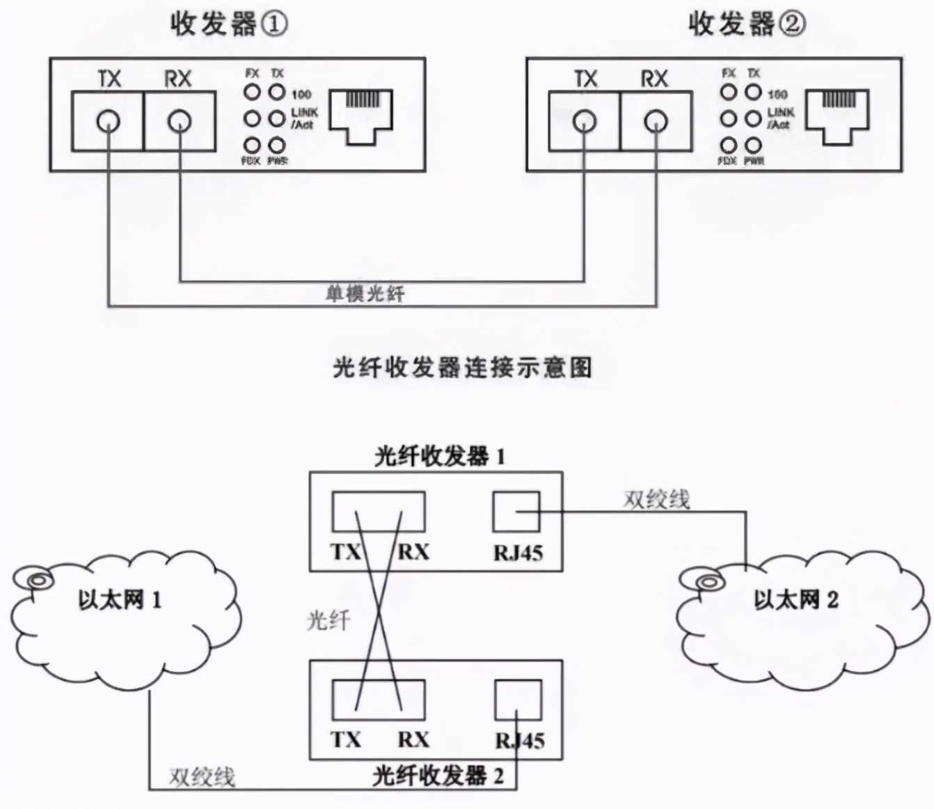1、光纤收发器到100BASE-TX设备(交换机,集线器)的连接;