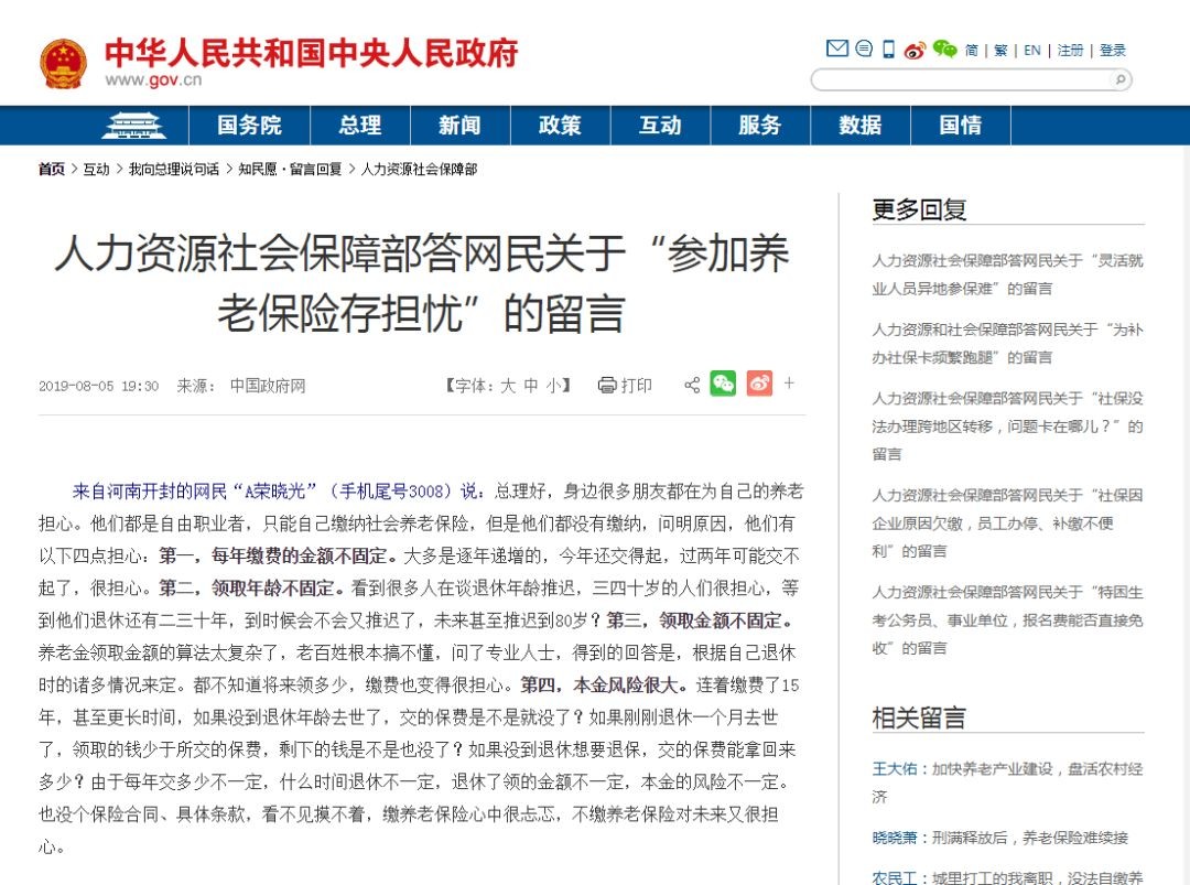 人力资源社会保障部在回复中国政府网网民关于“参加养老保险存担忧”的留言中表示: