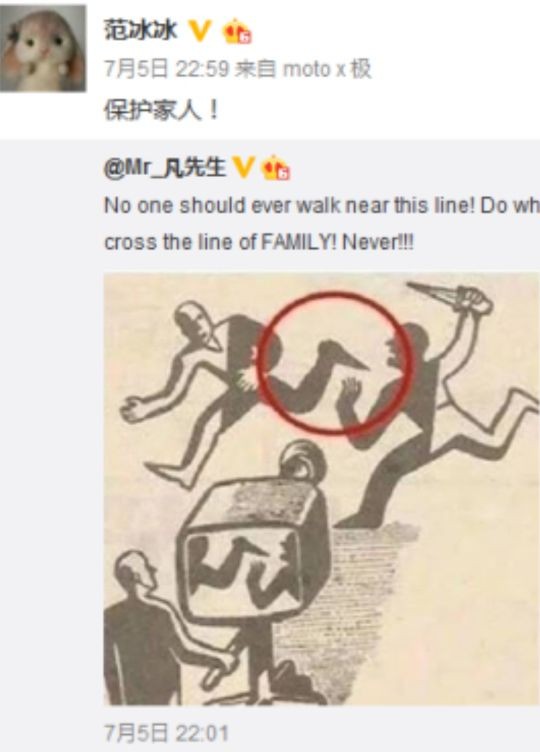范冰冰力挻吴亦凡,转发该微博表示支持,称“保护家人”。