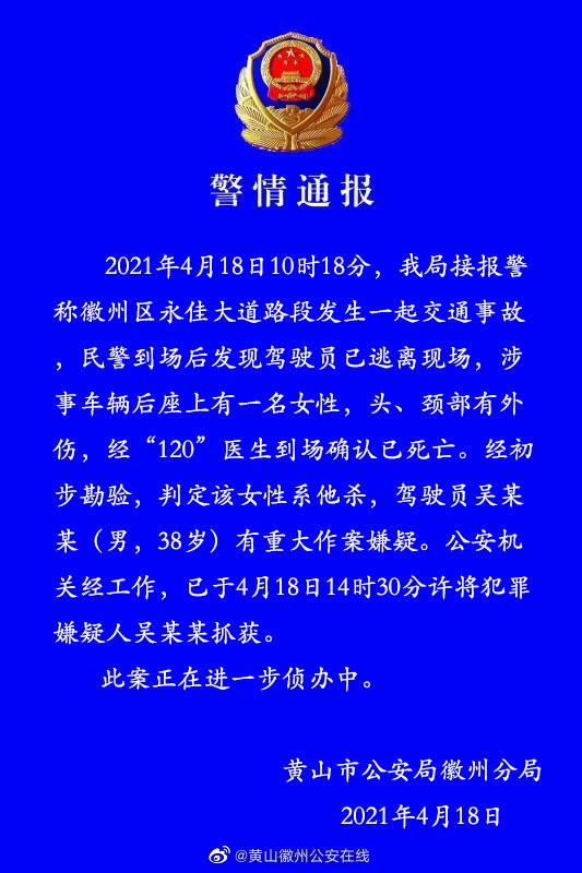 2021年4月18日10时18分,我局接报警称徽州区永佳大道路段发生一起交通事故民警到场后发现驾驶员已逃离现场,涉事车辆后座上有一名女性,头、颈部有外伤,经“120”医生到场确认已死亡。经初步勘验,判定该女性系他杀,驾驶员吴某某(男,38岁)有重大作案嫌疑。公安机关经工作,已于4月18日14时30分许将犯罪嫌疑人吴某某抓获。