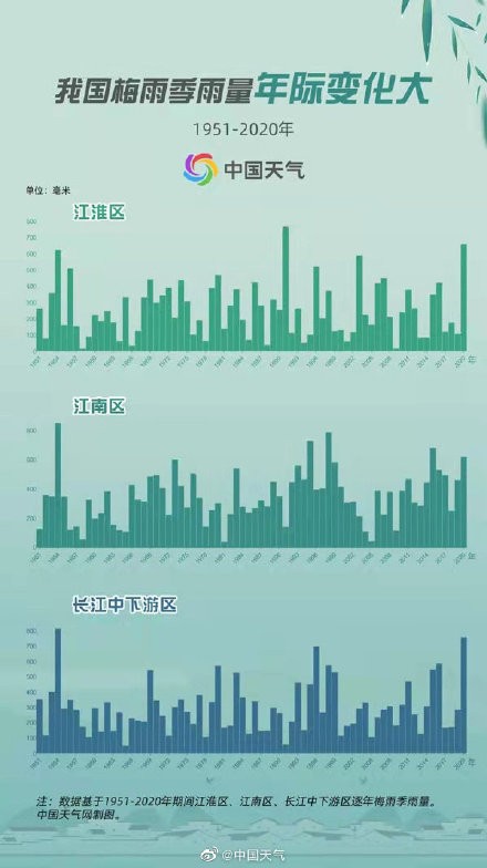 自古以来,每年梅雨时节的景象各不相同,呈现时多时少的特点。诗句就有“黄梅时节家家雨,青草池塘处处蛙。”“梅子黄时日日晴,小溪泛尽却山行”。诗人对梅雨的印象在历史数据中也得到了印证。从1951-2020年各梅雨区的降雨量变化来看,梅雨量的年际差异很大。在差异最大的江淮区,1991年梅雨季雨量最大,达766.4毫米,而最少的1958年仅有13.3毫米,相差57倍;江南区和长江中下游区梅雨季雨量最多年和最少年的差距也都超过400毫米。