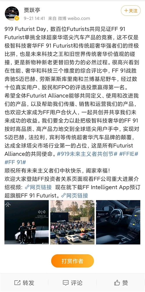 三言财经9月21日消息,今日下午,贾跃亭在其微博发文称,919 Futurist Day,数百位Futurists共同见证FF 91 Futurist单挑全球超豪华塔尖汽车产品的竞赛。